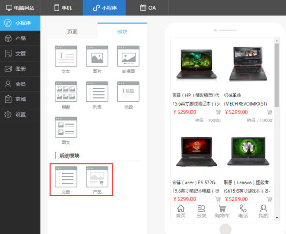 小程序新上线商品,文章模块!可以系统调用文章和商品的数据!商品的展示样式可以设置,1至3列。可以分别设置,价格、购物车、销量、市场价的显示以及样式设置。文章的样式设置同列表模块的样式一样。也支持丰富的个性化设置。