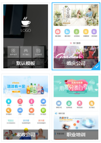 选择模板后您只需找到您“心水”的模板再稍作修改即可上线咯~其中展示型模板10套:婚庆公司、家政公司、职业培训、房地产中介、花店、水果超市、广告公司、美容美发、医疗卫生。商城型模板2套:宠物交易、IT数码之后我们每周至少会上线10套小程序模板供您选择,敬请期待