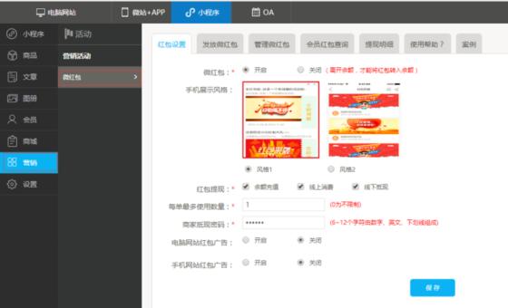 小程序新增红包功能,功能特点:1、后台可以发布多个红包活动,电脑、微信、小程序、APP数据保持统一。2、前台会员可以查看和领取红包3、领取的红包可以在订单支付中使用。4、红包记录可以会员中心查看5、小程序的页面模块可以通过查找链接指向红包
