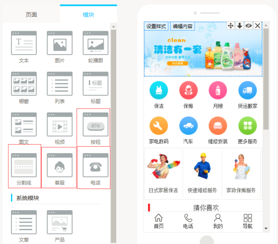 小程序新增客服,按钮,电话,分隔线等模块功能:1、客服功能(需要配置小程序客服)配置流程如下:A、登录小程序微信公众平台B、添加好后在后台添加客户模块(按钮样式非常灵活,可以自定义设置)C、生成小程序后,用户点击小程序的“联系客服”就可以直接和客服对话了!客服的登录入口,可以输入以下网址,然后扫描下面的二维码。https://mpkf.weixin.qq.com/2、按钮功能,样式非常灵活,可以设置一行1-5个。可以自由的定义样式,熟悉系统的用户,很容易就能用明白!3、电话模块,类似于按钮样式设置,添加后。用户点击可以直接拨打某个