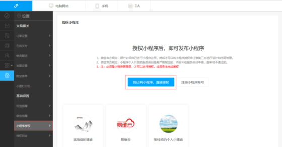 为了提高小程序打包的效率,减少复杂的绑定上传流程。我们对小程序一键打包进行了升级,升级后无需再下载小程序开发工具,可以直接在后台完成打包上传,以及发布,快速简单。1、先进行小程序授权。小程序管理后台-设置-小程序授权2、点击授权后会跳转至微信公众平台,然后扫码授权。注:必须是小程序管理员,才可以进行授权哦。成员无法完成授权。3、授权成功后,刷新后台的小程序授权页面,会看到刚才授权的小程序。(目前我们支持一个后台帐号,可以同时授权给5个小程序)4、授权成功后,在小程序设计界面,就可以直接上传和发布小程序了